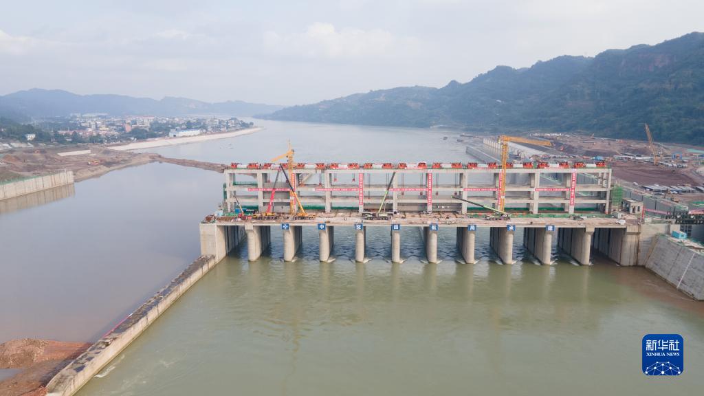這是長(cháng)江上游航運樞紐項目——岷江龍溪口航電樞紐工程施工現場(chǎng)(無(wú)人機照片,10月26日攝)。