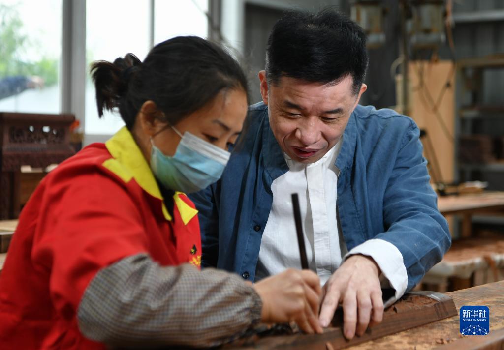 12月14日,古典家具技藝傳承人陳玉樹(shù)(右)指導員工進(jìn)行雕刻。