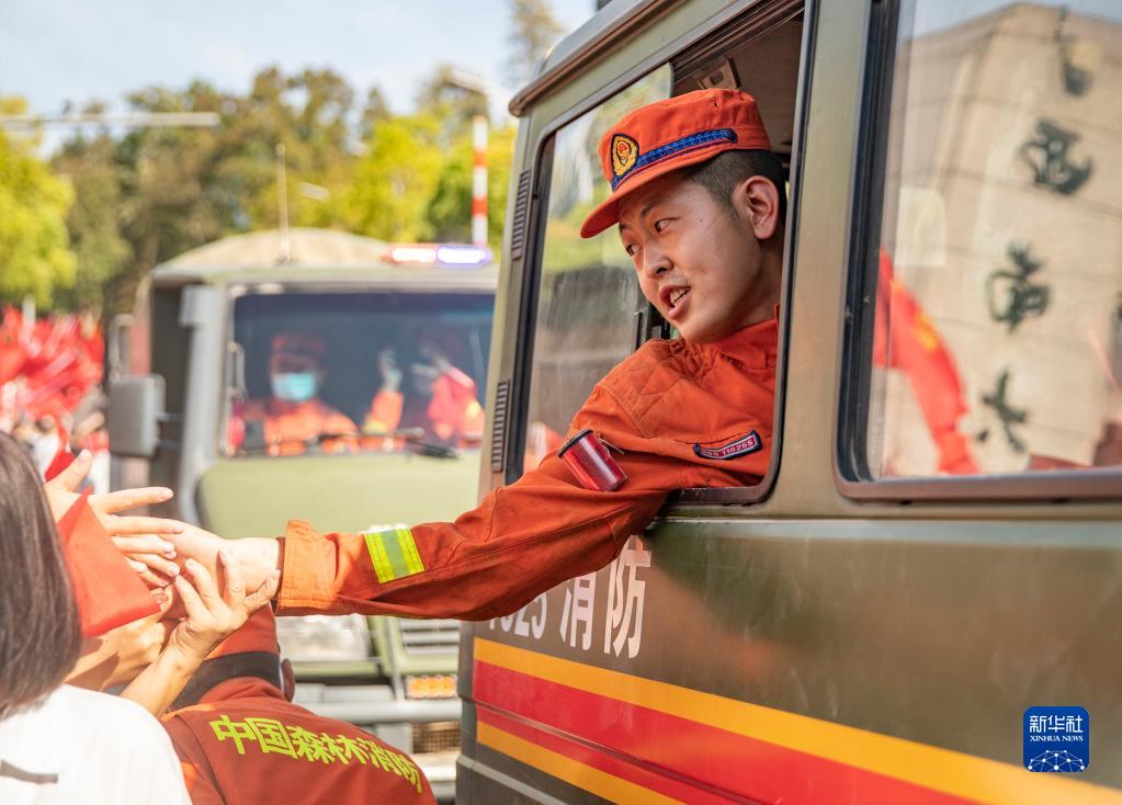 這是8月28日,在重慶市北碚區,參與山火撲救的云南森林消防隊員在完成任務(wù)撤離時(shí)與群眾握手道別。
