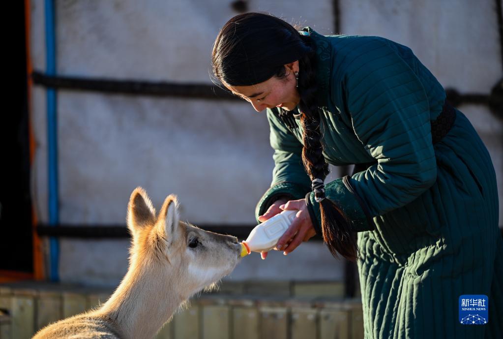 這是1月13日,在內蒙古錫林郭勒盟蘇尼特左旗賽罕高畢蘇木,“80后”蒙古族姑娘烏伊汗給被救助的小黃羊“蹦潑來(lái)”喂牛奶。