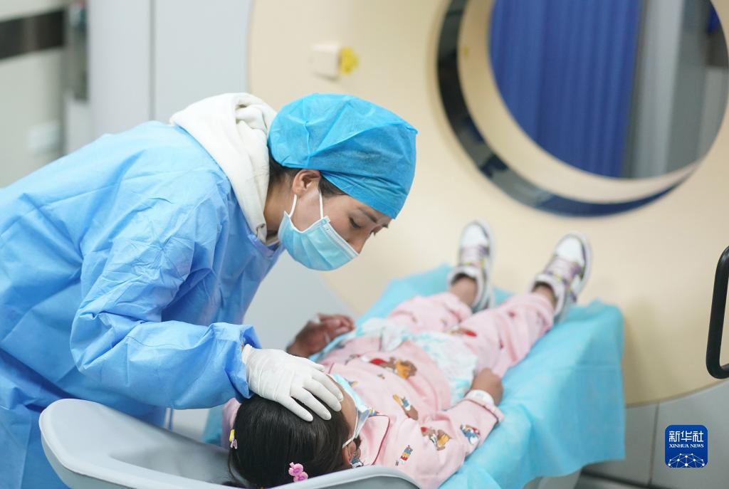這是5月12日,在位于江蘇省南京市的南京醫科大學(xué)第二附屬醫院,護士安慰準備接受CT增強檢查的西藏先天性心臟病小患者達瓦卓瑪。