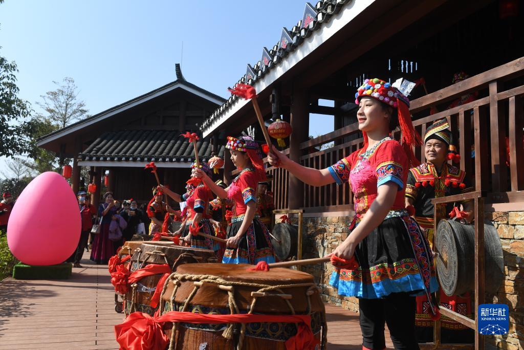 12月15日,人們在廣西河池園博園敲鼓迎賓客。