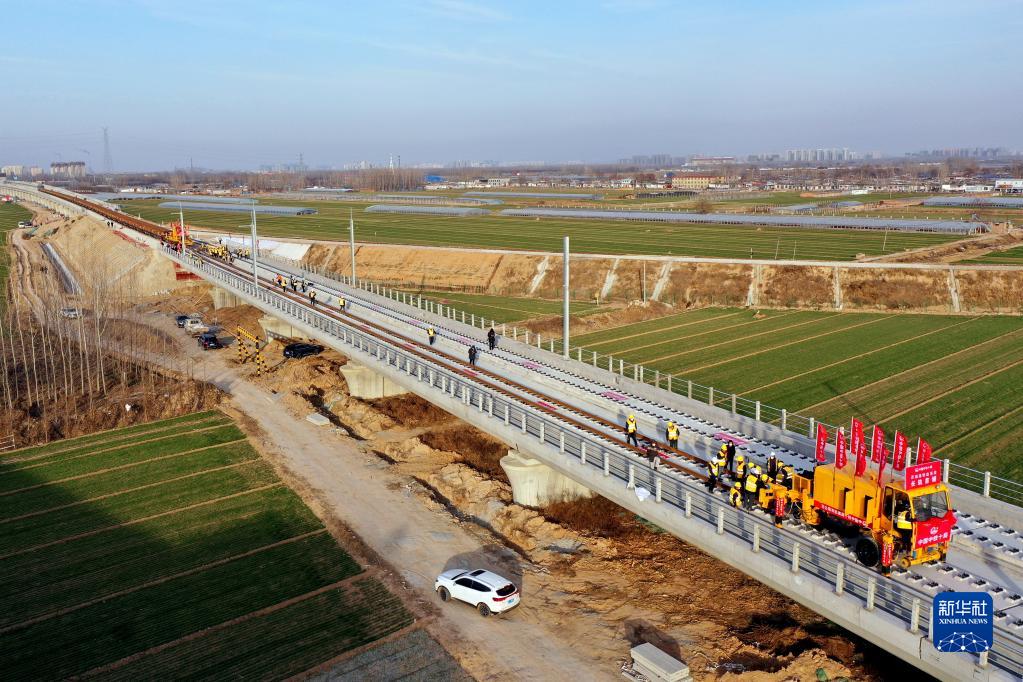 12月15日,在濟鄭高鐵山東聊城段,中鐵十局的工作人員在進(jìn)行鋪軌作業(yè)(無(wú)人機照片)。