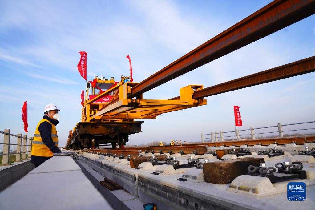 12月15日,在濟鄭高鐵山東聊城段,中鐵十局的工作人員在進(jìn)行鋪軌作業(yè)。