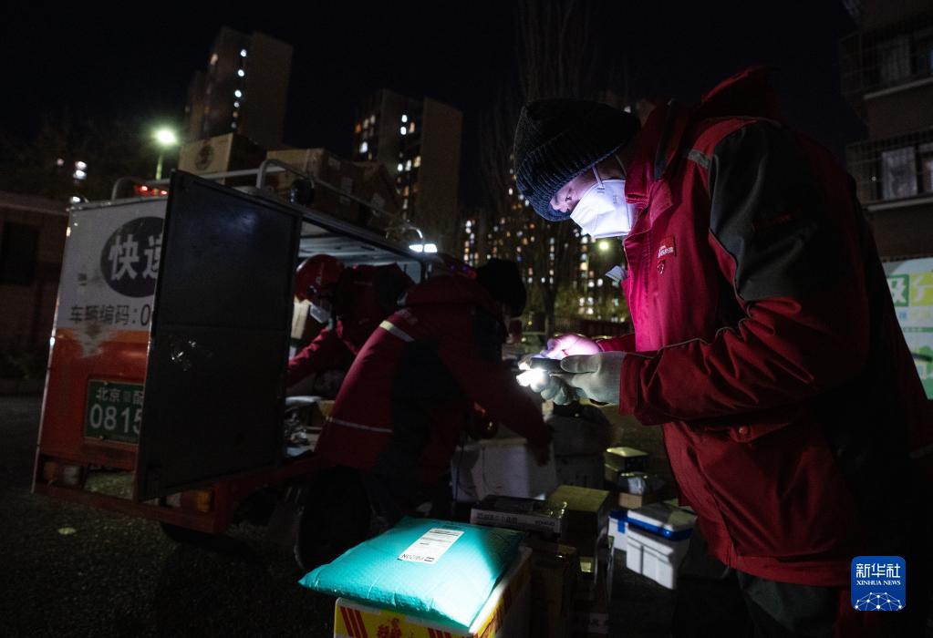 在北京市大興區新源時(shí)代小區,從西安赴京支援的快遞小哥王選軍(前)、齊帥龍(后左)和高興興按照樓號分貨(12月15日攝)。