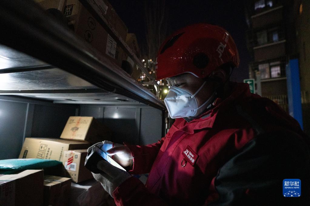 在北京市大興區新源時(shí)代小區,快遞小哥齊帥龍在核查配送信息(12月15日攝)。