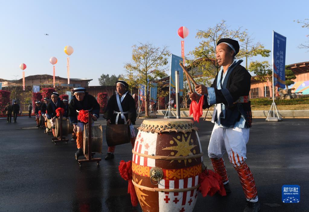 在廣西河池園博園,表演人員在敲鼓迎賓(12月15日攝)。