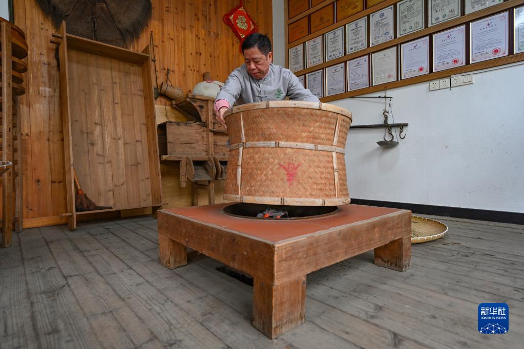 12月16日,在福州茉莉花茶制茶工坊,福州茉莉花茶傳統窨制工藝大師傅天甫進(jìn)行制茶的第五道工序“烘”?!昂妗笔菍⒉枞~均勻攤放在竹制焙籠上進(jìn)行烘焙。