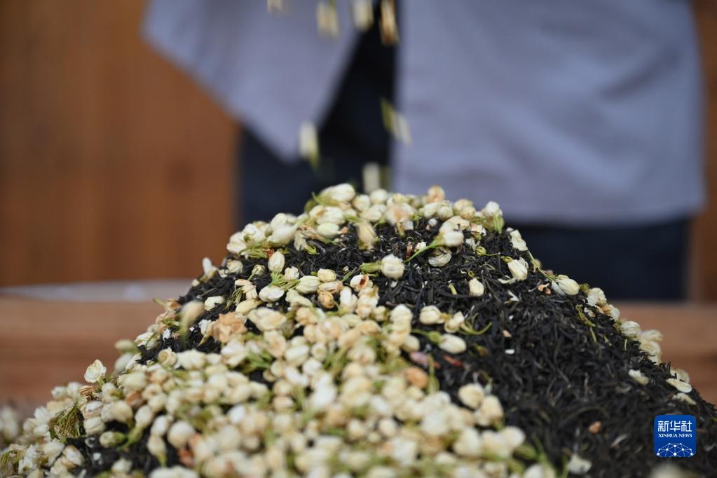 12月16日,在福州茉莉花茶制茶工坊,福州茉莉花茶傳統窨制工藝大師傅天甫進(jìn)行制茶的第七道工序“提”?!疤帷笔怯蒙倭?jì)?yōu)質(zhì)茉莉花再復窨一次,主要為了增強花茶香氣的鮮度。