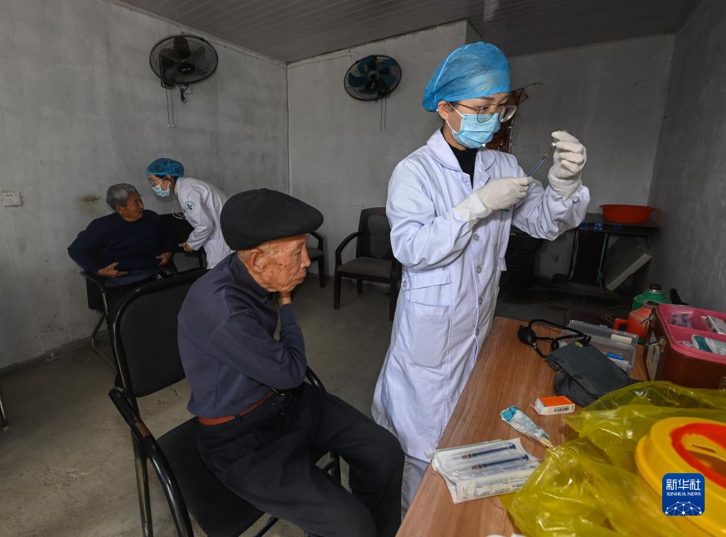 12月13日,浙江省湖州市吳興區東林鎮衛生院的醫務(wù)人員在東林鎮東明村為老人上門(mén)接種新冠疫苗。