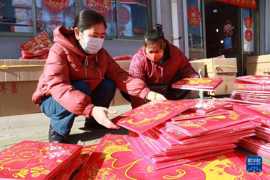12月18日,在山東省高密市夏莊鎮東李村春聯(lián)批發(fā)銷(xiāo)售點(diǎn),客商在挑選春聯(lián)產(chǎn)品。