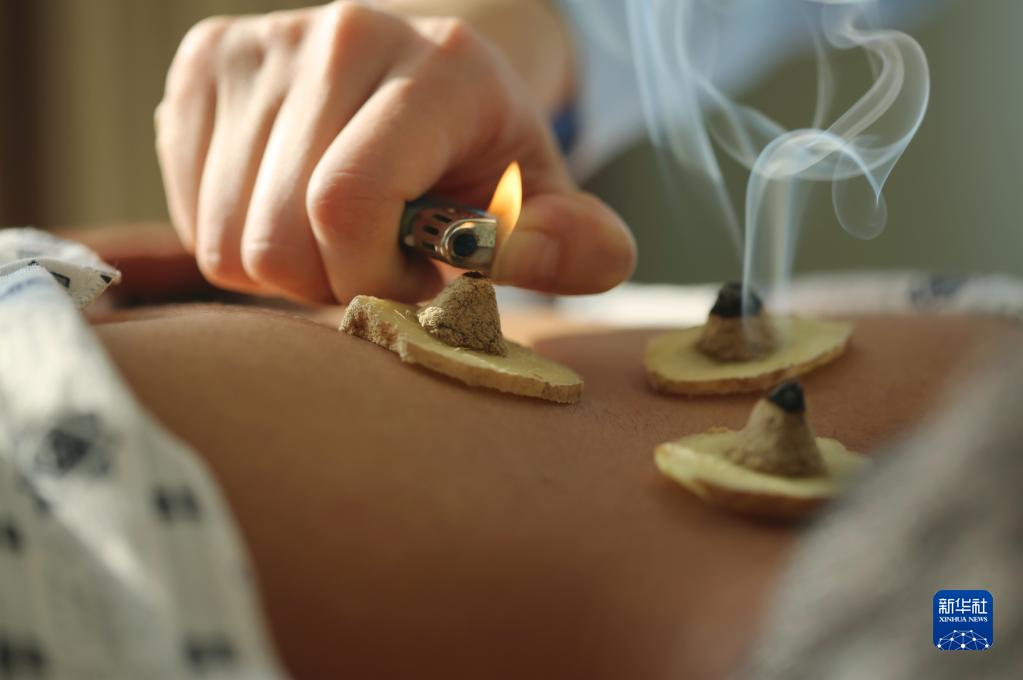 12月19日,山東省臨沂市沂南縣中醫醫院,醫務(wù)人員為市民進(jìn)行穴位艾灸。新華社發(fā)(王彥冰 攝)