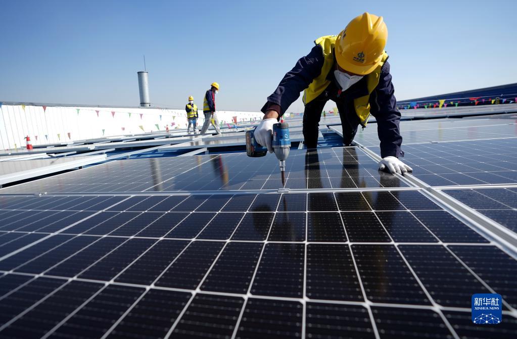2022年10月11日,工人在河北省唐山市蘆臺經(jīng)濟開(kāi)發(fā)區一家企業(yè)廠(chǎng)房屋頂安裝光伏發(fā)電板。