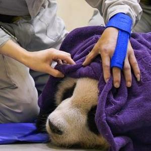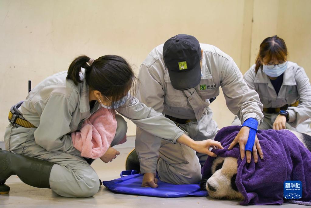 2022年11月19日,臺北動(dòng)物園工作人員在照顧病中的大陸贈臺大熊貓“團團”。