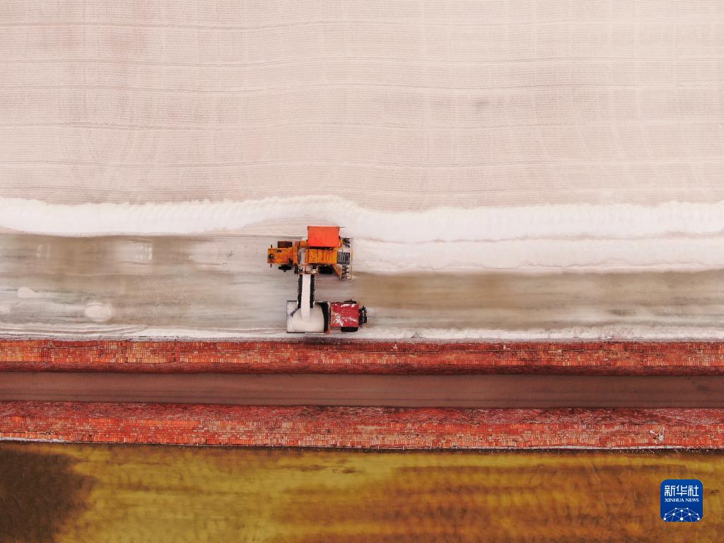 10月27日,在山東省濱州市沾化區濱海鎮金盛海洋鹽場(chǎng),工人在收獲秋鹽(無(wú)人機照片)。