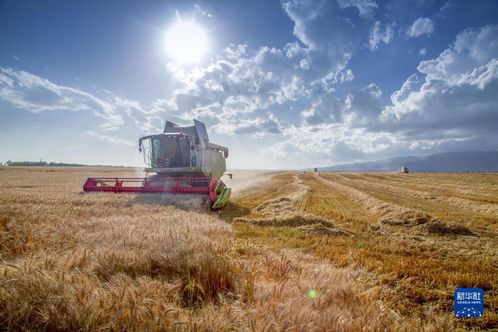 8月16日,農民操作聯(lián)合收割機在新疆昭蘇高原一處麥田里勞作。