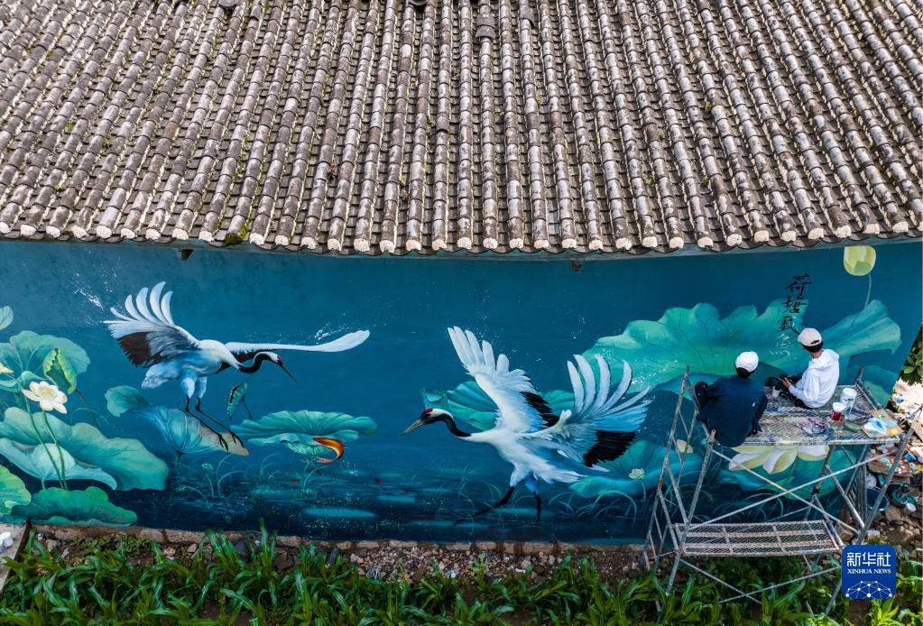 6月24日, “95后”公益墻繪師劉志誠(右)在云南省麗江市永勝縣三川鎮進(jìn)行墻繪創(chuàng )作(無(wú)人機照片)。