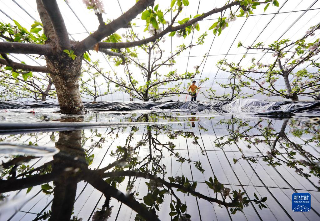 1月11日,河北省灤州市茨榆坨鎮建民種植專(zhuān)業(yè)合作社的一名社員在大棚內給櫻桃樹(shù)澆水。