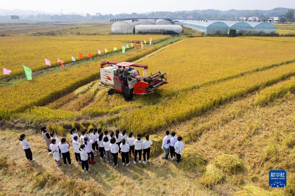 11月1日,湖南省常德市桃源縣寺坪中學(xué)在農田開(kāi)展“田間課堂”活動(dòng)。這是學(xué)生觀(guān)看農機收獲水稻(無(wú)人機照片)。