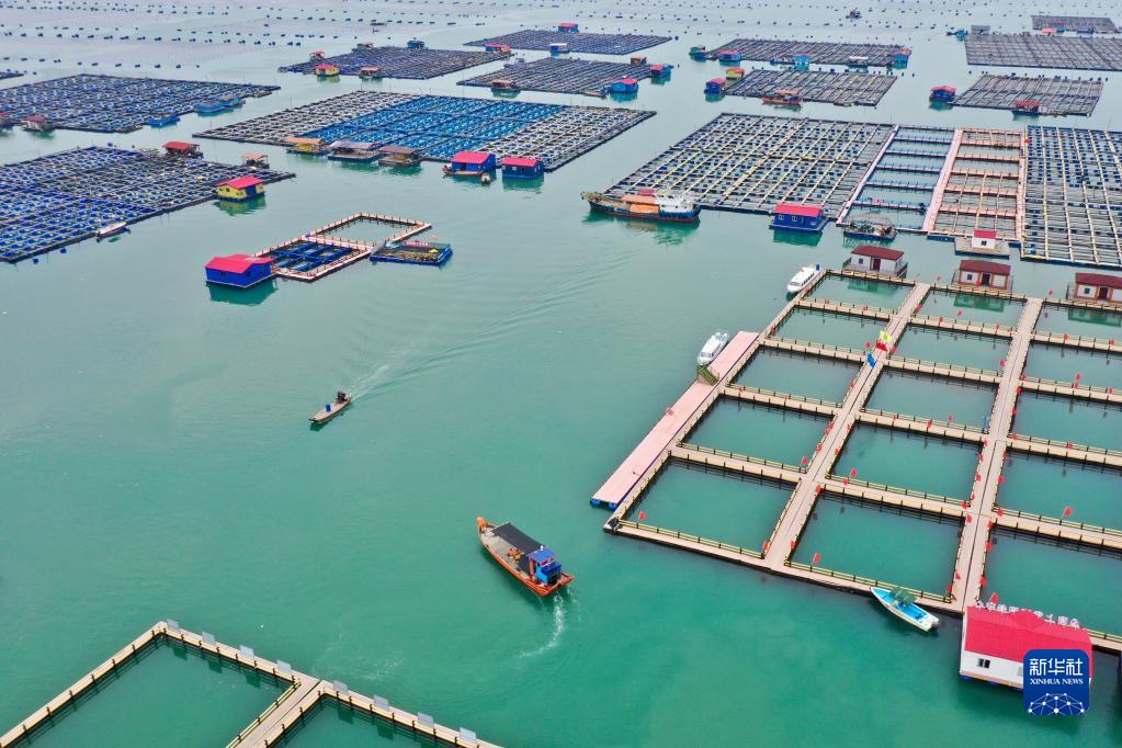 7月1日,游客乘漁船在福建省霞浦縣溪南鎮七星海域深水網(wǎng)箱養殖區參觀(guān)(無(wú)人機照片)。