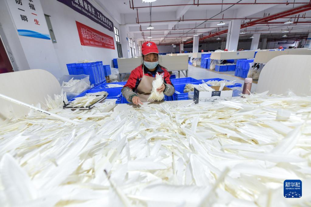 在錦屏經(jīng)濟開(kāi)發(fā)區貴州亞獅龍體育文化產(chǎn)業(yè)發(fā)展有限公司羽毛球生產(chǎn)基地,工人在分級生產(chǎn)羽毛球所需的鵝毛(12月19日攝)。
