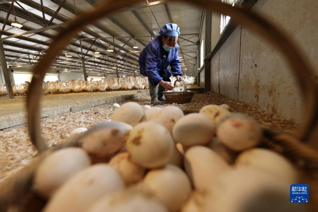 員工在貴州省錦屏縣銅鼓鎮馬臺生態(tài)種鵝養殖基地撿鵝蛋(3月22日攝)。