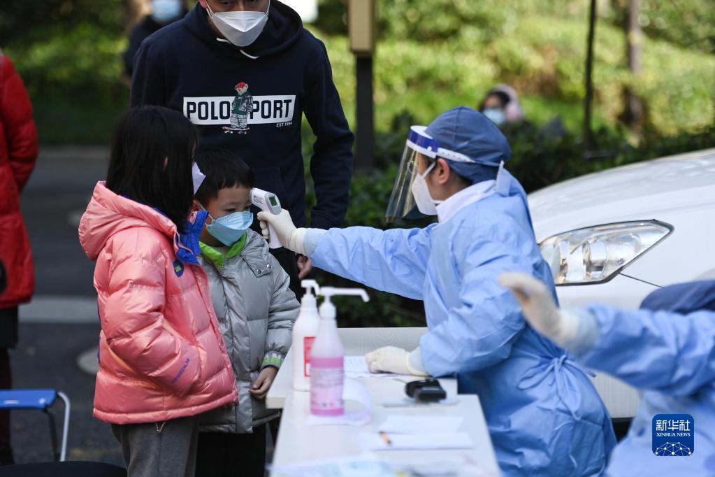 12月21日,杭州市西湖區留下街道社區衛生服務(wù)中心的醫護人員在和家園南社區為發(fā)熱居民測溫、診療。