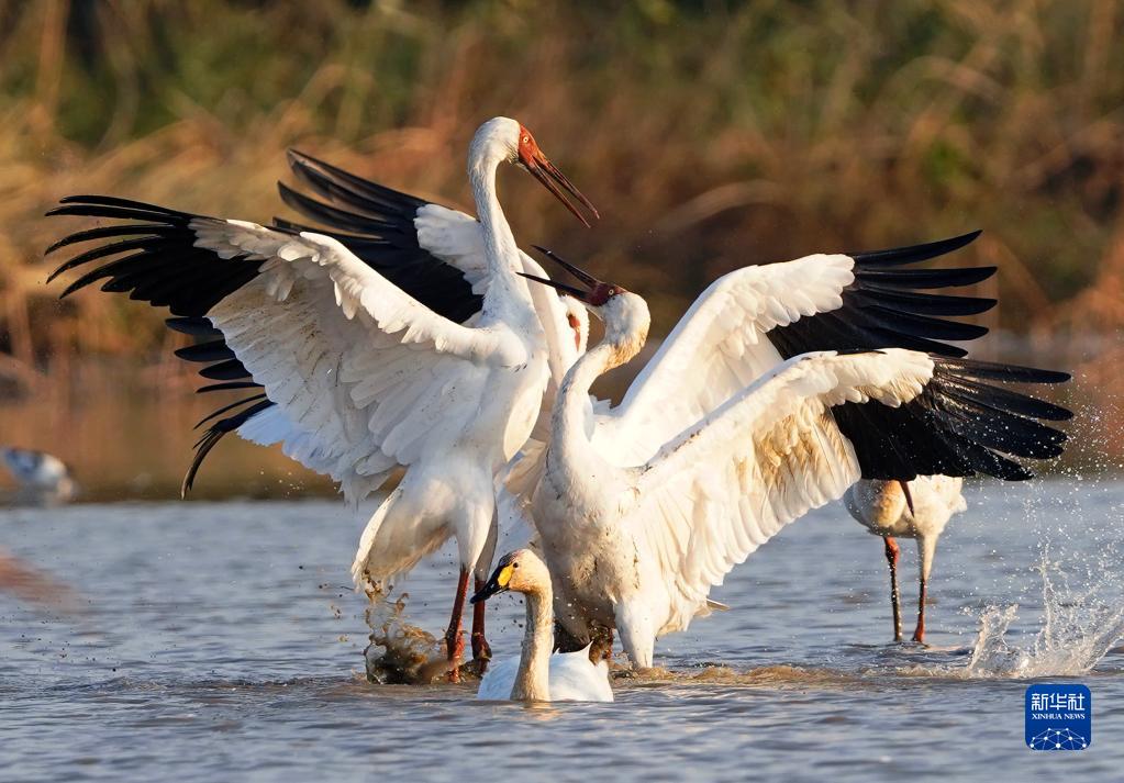 白鶴在南昌高新區五星白鶴保護小區嬉戲(12月21日攝)。