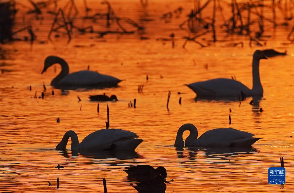 天鵝等候鳥(niǎo)在南昌高新區五星白鶴保護小區棲息(12月21日攝)。