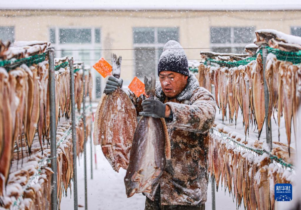 12月22日,在山東省榮成市石島管理區王連街道北橋頭村一處漁家院,農戶(hù)在擺放晾制的魚(yú)干。