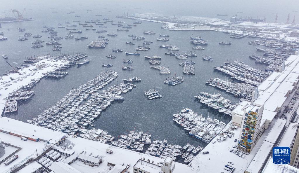 12月22日,漁船??吭谏綎|省榮成市石島管理區石島漁港躲避暴風(fēng)雪(無(wú)人機照片)。
