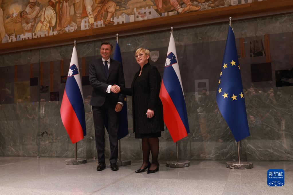 12月22日,在斯洛文尼亞首都盧布爾雅那舉行的總統就職儀式上,娜塔莎·皮爾茨·穆薩爾(右)與博魯特·帕霍爾握手。
