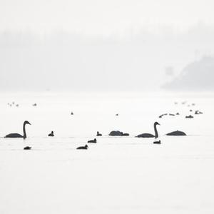 近日,青海省海東市化隆回族自治縣群科鎮的黃河上迎來(lái)近百只越冬的大天鵝,為冬日高原增添了一抹生機。