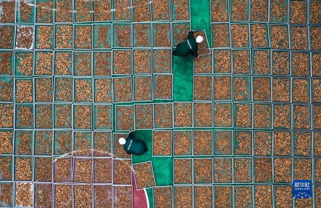 12月22日,工人在貴州省黎平青江農業(yè)開(kāi)發(fā)有限公司晾曬天麻(無(wú)人機照片)。