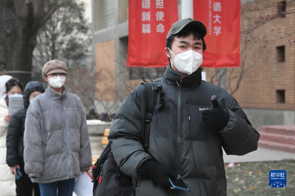 12月24日,在北京外國語(yǔ)大學(xué)考點(diǎn),北京外國語(yǔ)大學(xué)歐洲語(yǔ)言文化學(xué)院考生杜秋卓(右一)準備進(jìn)入考場(chǎng)。