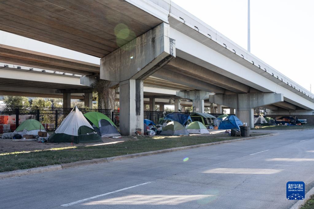 這是12月23日在美國休斯敦市拍攝的無(wú)家可歸者的帳篷。