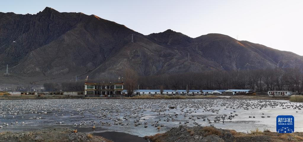 冬日清晨,拉薩市林周縣邊交林鄉的池塘里,大量斑頭雁、赤麻鴨等候鳥(niǎo)棲息(12月24日攝,手機照片)。