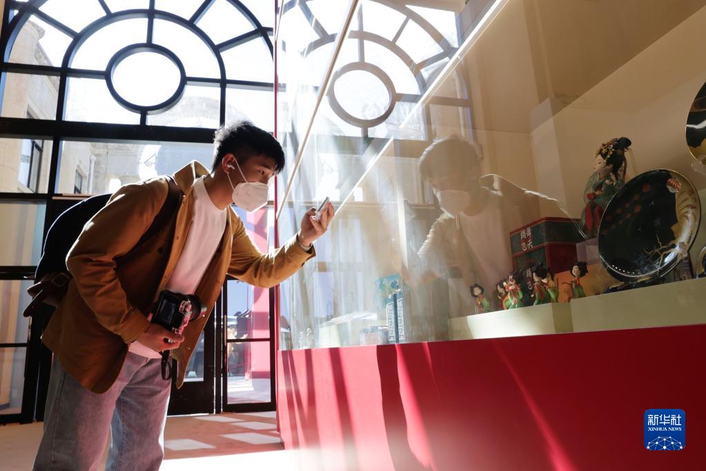 2022年10月10日,在北京展覽館,觀(guān)眾在“奮進(jìn)新時(shí)代”主題成就展第五單元“堅定文化自信 建設社會(huì )主義文化強國”展廳拍攝展示代表性非遺作品和文創(chuàng )精品的博古架。
