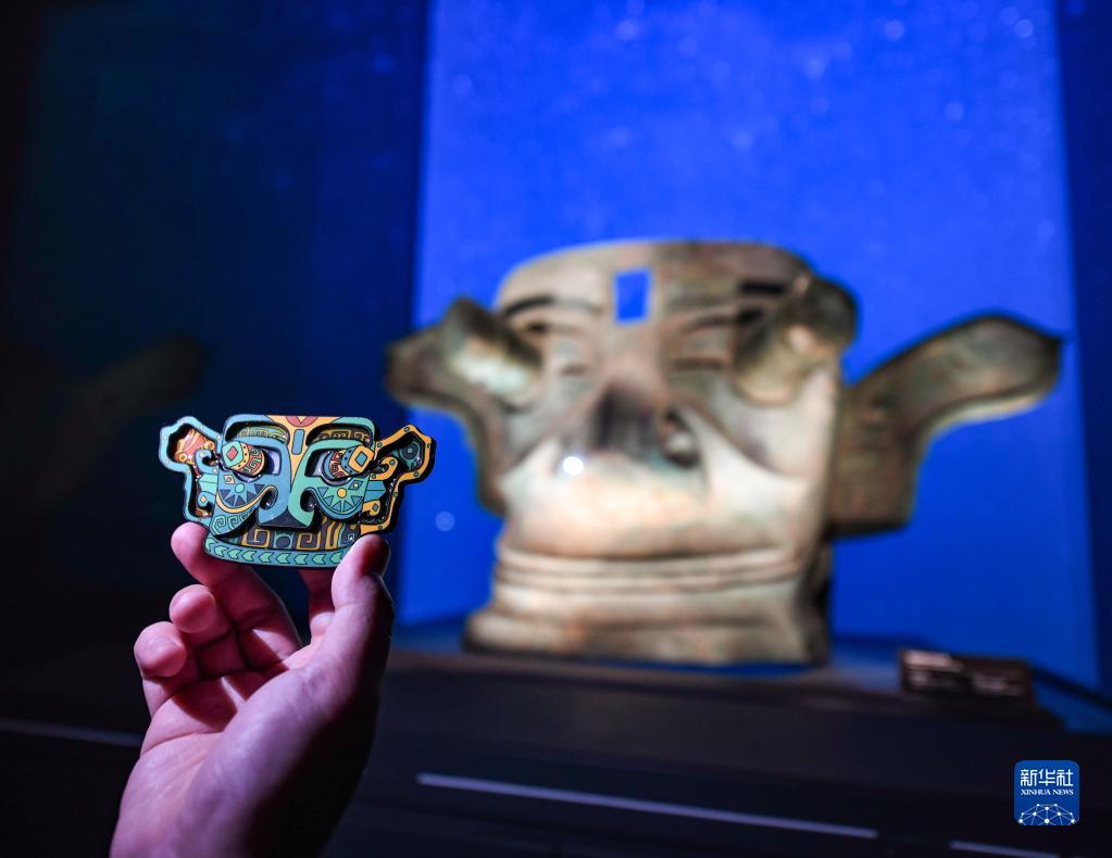 這是2022年5月16日在三星堆博物館拍攝的青銅縱目面具文創(chuàng )冰箱貼。近年來(lái),三星堆遺址重要考古發(fā)現成果陸續公布,帶動(dòng)三星堆博物館的文創(chuàng )產(chǎn)品設計銷(xiāo)售熱潮,一些文創(chuàng )產(chǎn)品取材于發(fā)掘出土的金面罩、青銅器等文物,受到人們的歡迎。