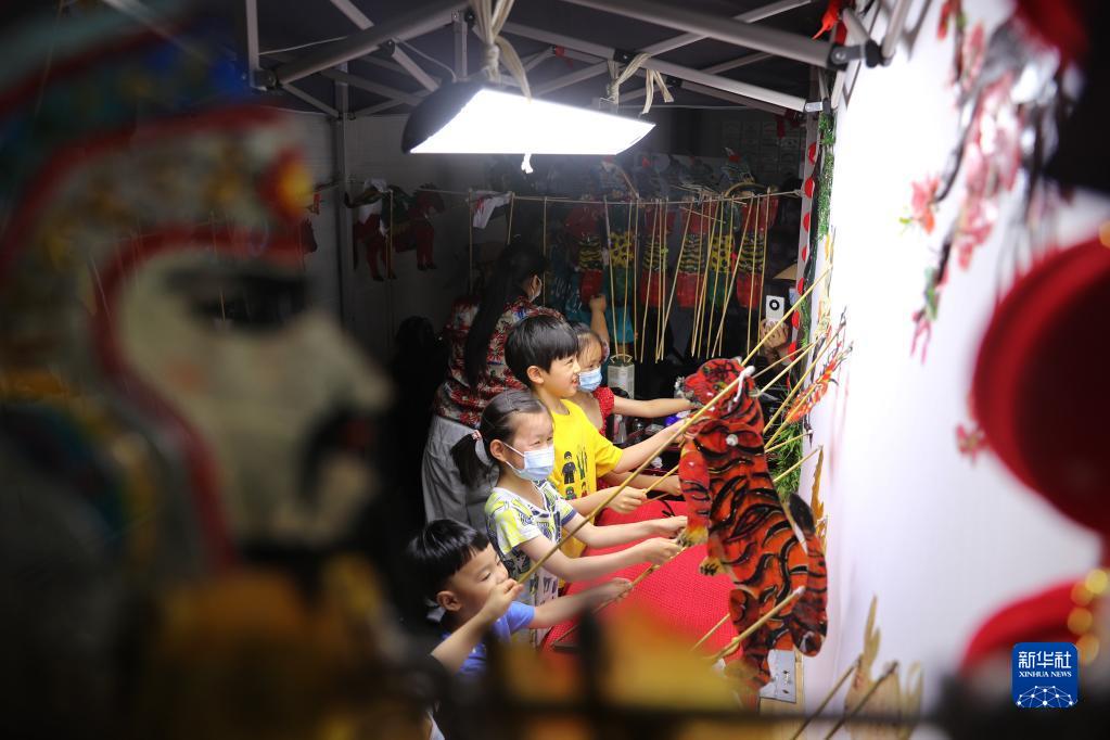 2022年6月11日,文化和自然遺產(chǎn)日,小朋友在位于合肥市的安徽博物院體驗皮影戲,感受傳統文化的魅力。