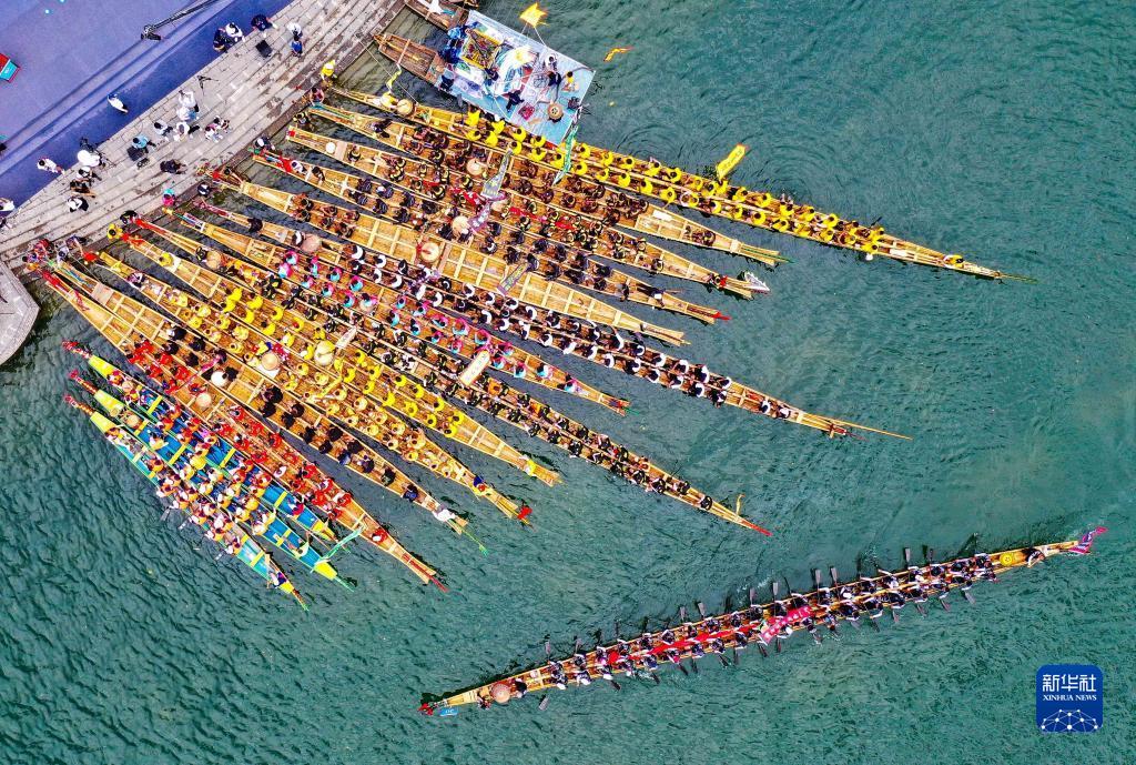 2022年7月22日,貴州省黔東南苗族侗族自治州鎮遠縣舉行龍舟文化節活動(dòng),參賽龍舟隊在鎮遠縣?陽(yáng)河上集結(無(wú)人機照片)。近年來(lái),貴州省黔東南苗族侗族自治州鎮遠縣將龍舟文化作為旅游產(chǎn)業(yè)發(fā)展的重要抓手,通過(guò)開(kāi)展龍舟比賽、龍舟巡游等活動(dòng),吸引游客觀(guān)光游覽。