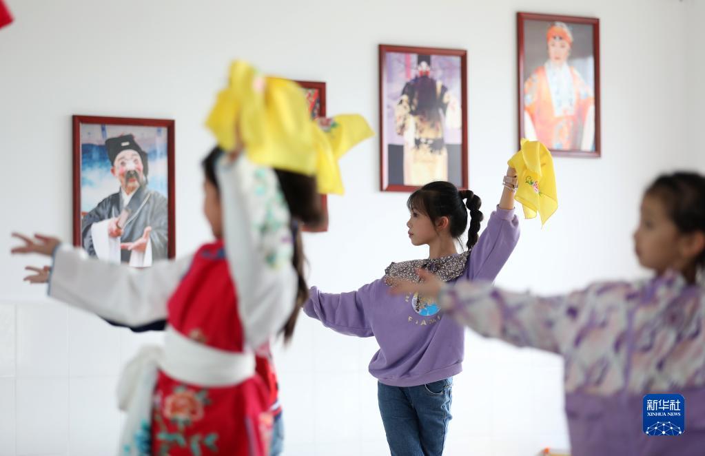 2022年5月25日,湖南省資興市鯉魚(yú)江完全小學(xué)的學(xué)生在練習戲曲基本動(dòng)作。近年來(lái),湖南省資興市積極推進(jìn)傳統戲曲進(jìn)校園,通過(guò)設立培訓基地、興趣班、“第二課堂”等形式,邀請專(zhuān)業(yè)戲曲老師走進(jìn)校園,為學(xué)生進(jìn)行京劇、花鼓戲等教學(xué)輔導,讓孩子們感受非遺文化的魅力。