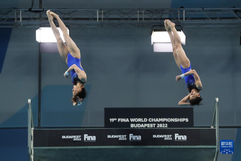這是2022年6月30日,陳芋汐(左)/全紅嬋在匈牙利布達佩斯舉行的2022年世界游泳錦標賽跳水項目女子雙人10米臺決賽中。
