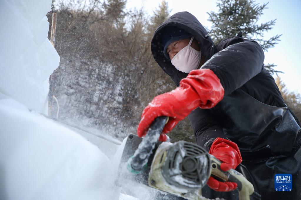 12月26日,在甘肅省渭源縣天井峽(渭河東源)景區,工作人員在制作雪雕。