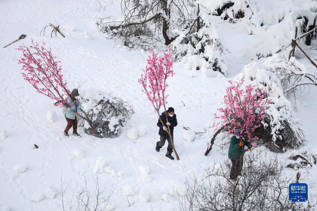 12月26日,在甘肅省渭源縣天井峽(渭河東源)景區,工作人員搬運雪景裝飾品。