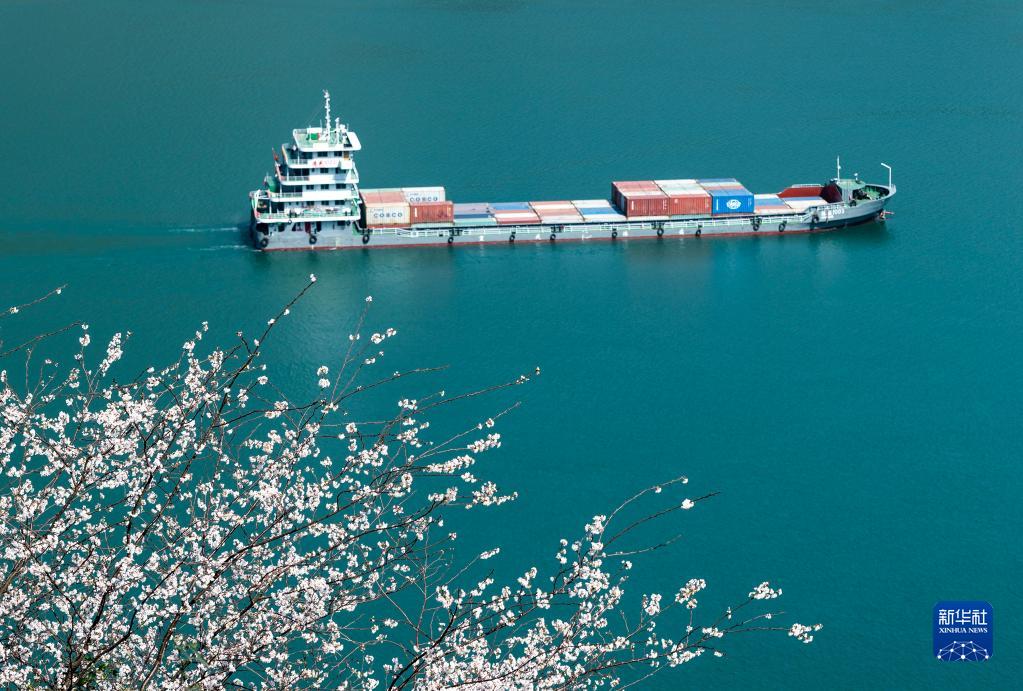一艘貨船行駛在春花掩映下的長(cháng)江三峽湖北省宜昌市秭歸縣水域(2022年3月8日攝)。
