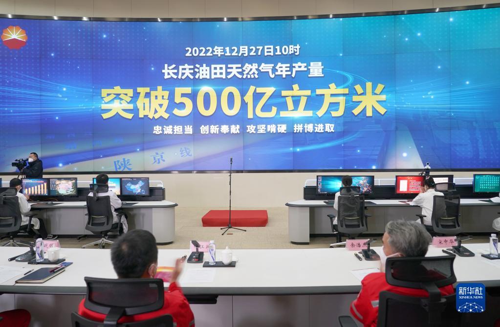 12月27日,在位于陜西西安的中國石油長(cháng)慶油田生產(chǎn)指揮中心內,電子屏上顯示天然氣年產(chǎn)量突破500億立方米。