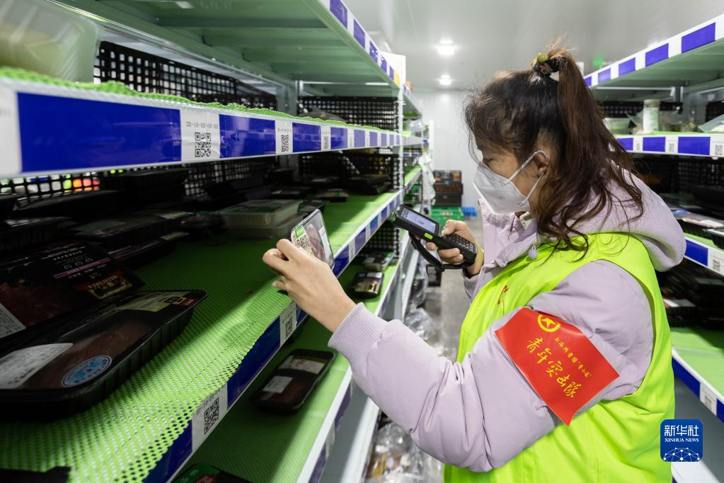 12月27日,在上海市徐匯區的美團買(mǎi)菜前置倉,青年突擊隊隊員掃碼商品條形碼,確定商品是否匹配。