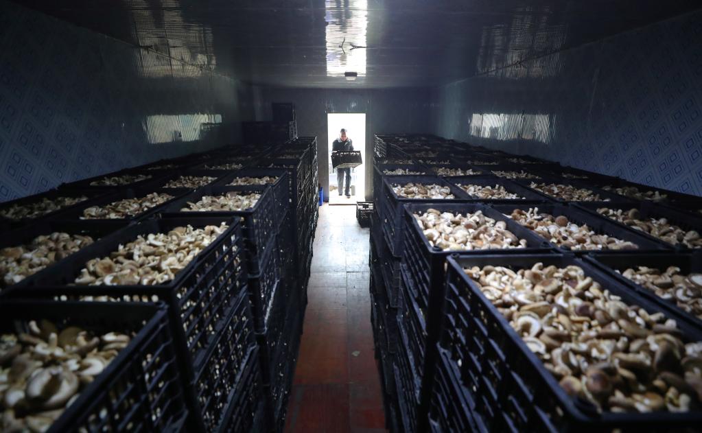 12月27日,在衡東縣三樟鎮義門(mén)村,村民將采摘的香菇裝進(jìn)冷庫存放。