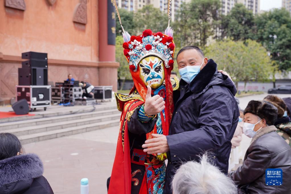 12月27日,在眉山市彭山區觀(guān)音街道龍門(mén)橋社區,演員與觀(guān)眾互動(dòng)。